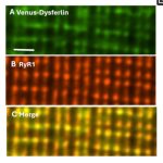 Figure 2 Dysferlin and RyR1 colocalize at triad junctions. Flexor digitorum brevis muscles of A/J mice were transfected by electroporation to express Venus-dysferlin Cells, 14(21), 1724. https://doi.org/10.3390/cells14211724